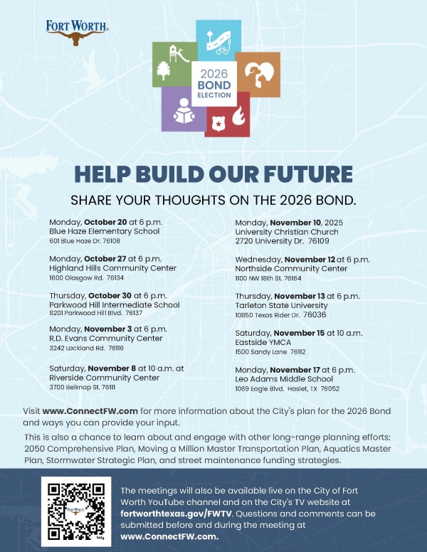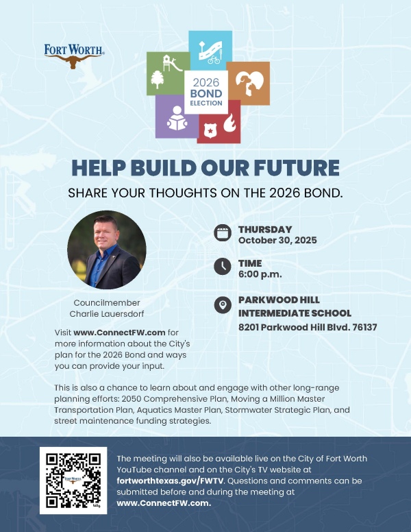 This is a friendly reminder that there will be a Fort Worth District 4 Budget Meeting (Townhall meeting will be tentatively scheduled) that will discuss budget plans and meet with various city departments and leadership. Please join us on Thursday, August 29th, 2024 at 3100 Clay Mountain Trail, Fort Worth, TX 76137. To RSVP please use the QR code to reserve your spot.